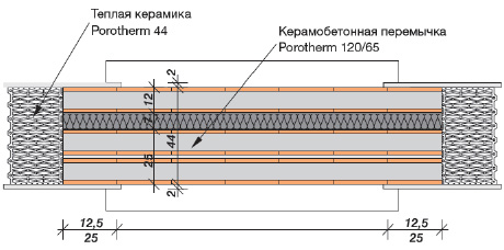 При кладке стены над перемычками нужно нанести раствор на все постельные и стычные швы, даже если используются кладочные блоки для периметральной кладки с высоким термическим сопротивлением, у которых обычно раствор на вертикальные стычные швы не наносится. То есть все швы в кладке над перемычкой заполняются раствором (даже если используется блок Porotherm, то заполнить вертикальный шов паз-гребень обязательно) Несущая способность перемычек обеспечивается за счет совместной работы самой керамобетонной перемычки и каменной кладки из камней 2,1 НФ, уложенных в несколько рядов в зависимости от нагрузки, или кладки из крупноформатных керамических блоков с заполнением вертикальных швов раствором.